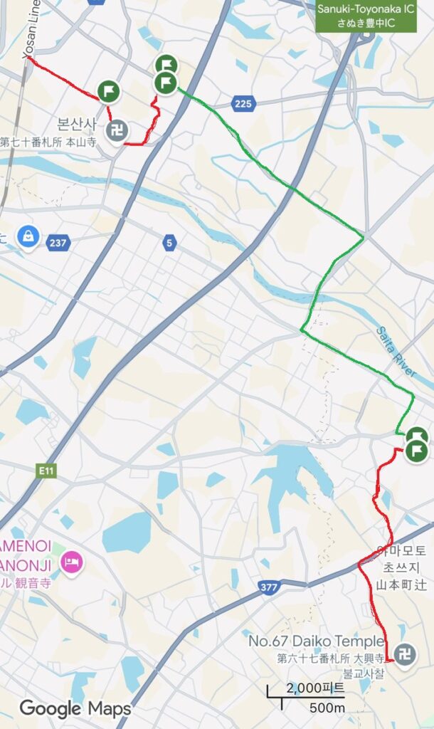Yosan의 Y가 모토야마역. 빨간색: 도보, 녹색: 버스. 아래 축척을 참고해주세요