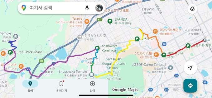노랑: 카페 아사히나에서 숨을 돌린 후 73번 슛샤카지까지 도보