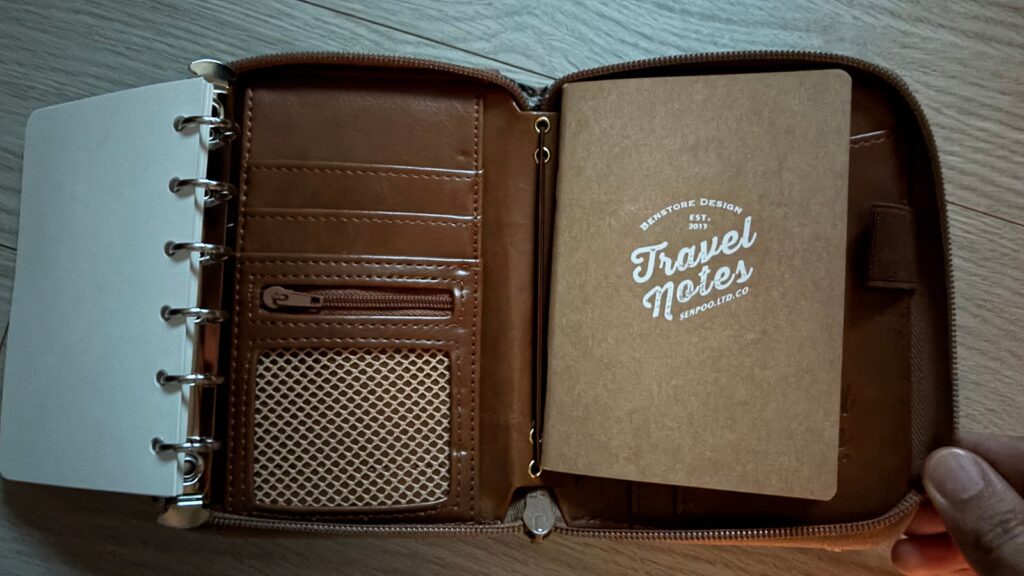 6공을 왼쪽에 끼우고 가운데 고무줄과 오른쪽 슬립에 여권을 하나씩 끼울 수도 있습니다(이 경우 펜꽂이를 못씀)
